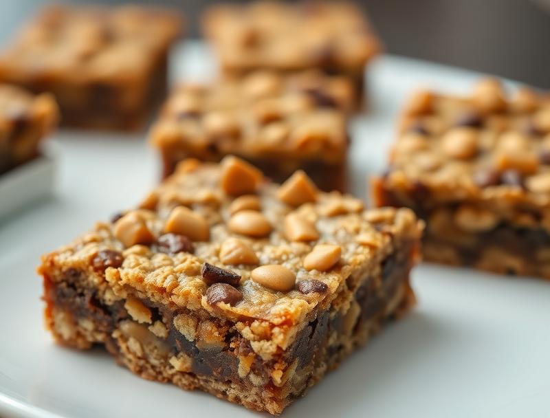 A delicious dessert combining oatmeal, chocolate, and caramel in layered bars.