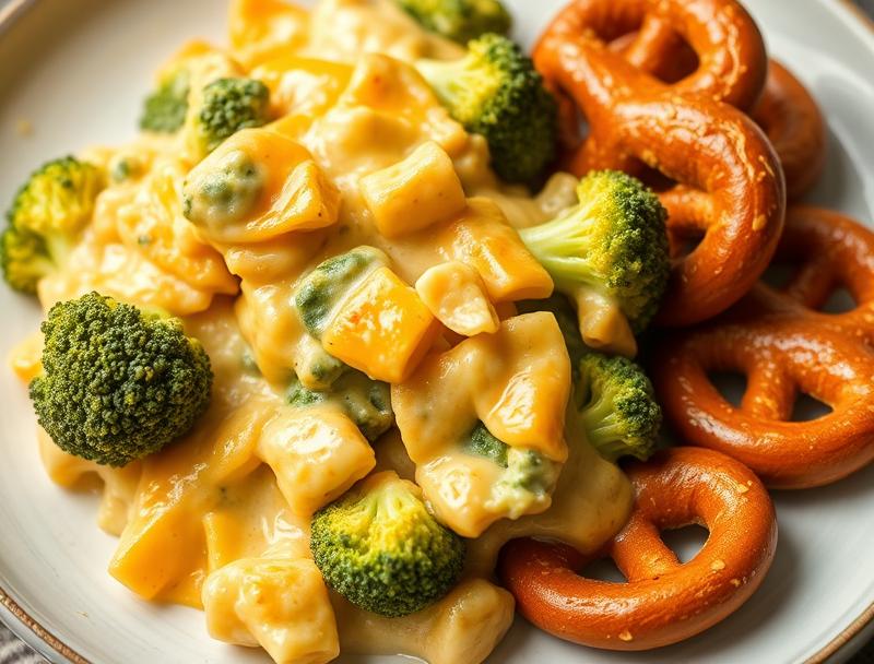 A comforting casserole combining steamed broccoli, a rich cheddar cheese sauce, and crunchy garlic butter pretzels, perfect for family dinners or gatherings.