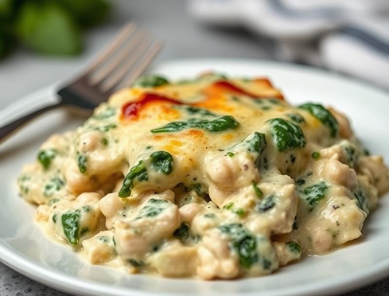 A creamy and comforting casserole filled with chicken, spinach, and a blend of cheeses, perfect for an easy dinner solution.