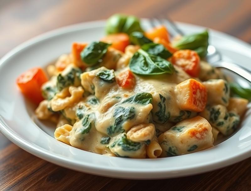 A creamy, comforting casserole combining chicken, spinach, and pasta in a rich, cheesy sauce, perfect for easy dinners.