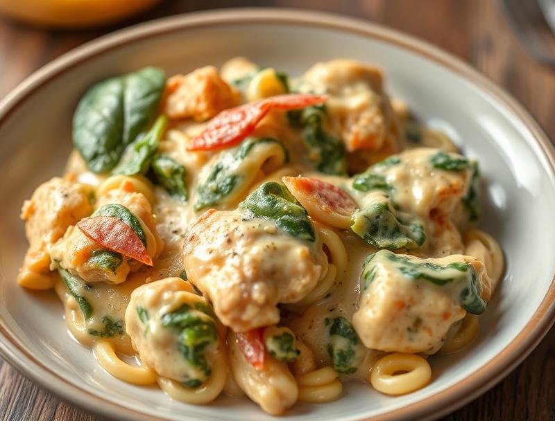 A creamy, comforting casserole filled with chicken, spinach, and cheese, perfect for an easy dinner.