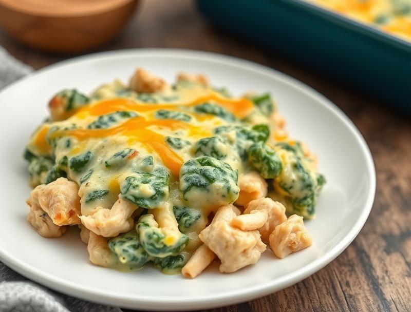 A creamy, savory, and fresh casserole combining chicken, spinach, and a blend of cheeses, perfect for an easy and delicious dinner.