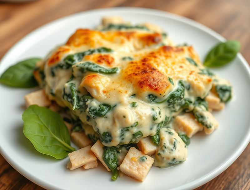 A creamy, comforting casserole filled with chicken, spinach, and a blend of cheeses, perfect for an easy and satisfying dinner.