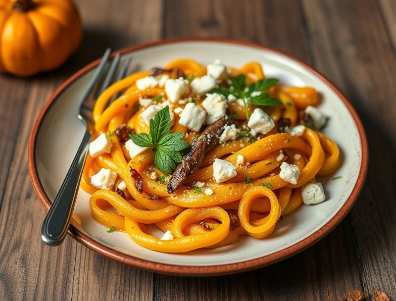 A creamy, savory pasta dish filled with the warmth of roasted pumpkin, tangy feta, and aromatic spices, perfect for the fall season.