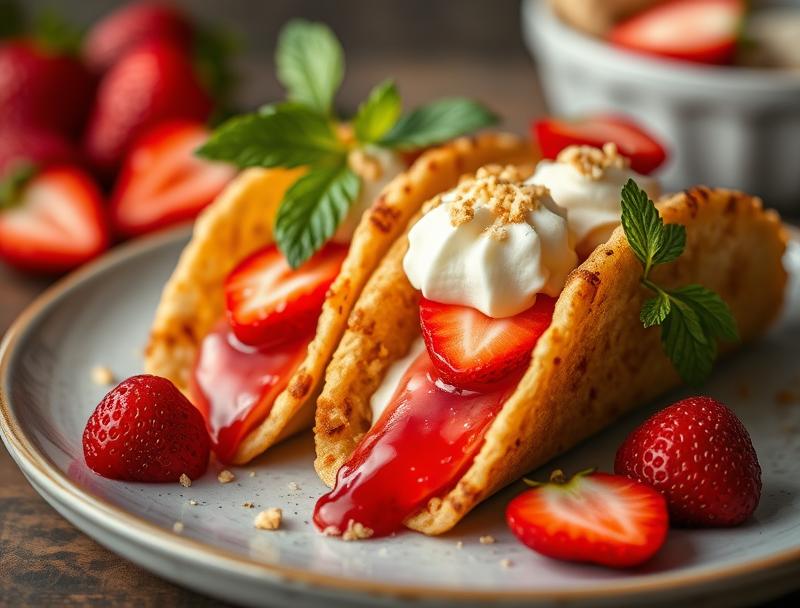 - Step 4: Garnish the dessert tacos with chopped fresh strawberries and a sprinkle of granulated sugar. Serve immediately and enjoy!