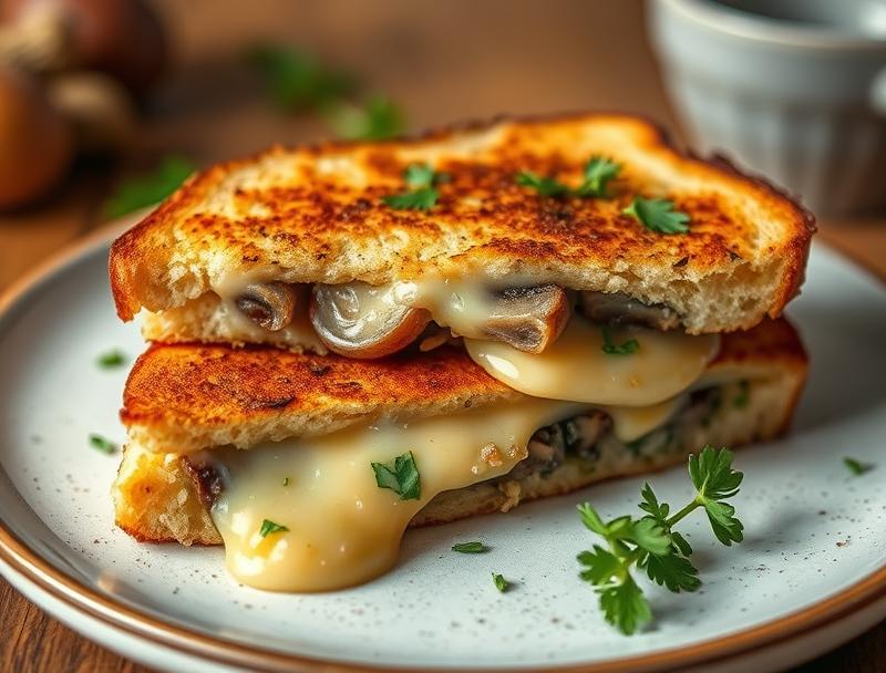 A gourmet grilled cheese sandwich filled with sautéed garlic mushrooms and melted cheese, perfect for a satisfying meal.