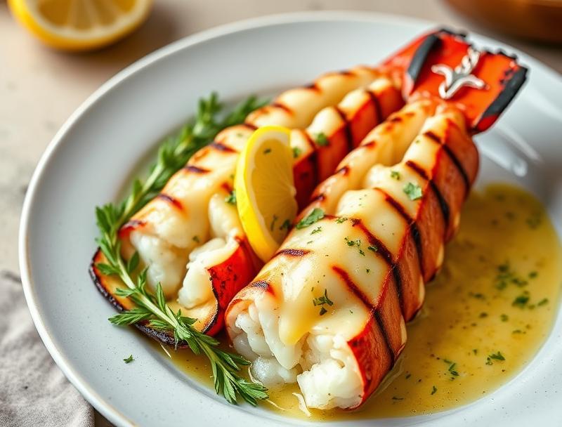 A luxurious seafood dish featuring grilled lobster tails served with a rich garlic lemon butter sauce, perfect for special occasions or weeknight dinners.